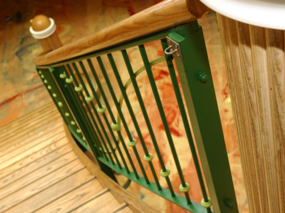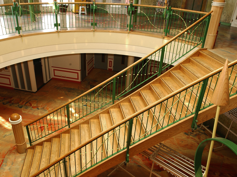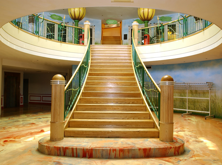 Duinrell, daar kikker je van op! Bij zo'n bijzondere locatie hoort ook een unieke trap en deze is dan ook ontworpen door een architect. Wij plaatsten hier een steektrap met gebogen bomen voor een theatraal effect. Deze royale steektrap met gebogen, uitwaaierende trapbomen is uitgevoerd in Amerikaans esdoorn, wat ook wel hard maple wordt genoemd. Er zit een bruine doorlopende antislipstrip van rubber onder de treden. De balustraden zijn van gemoffeld staal. Het resultaat mag er zeker zijn!