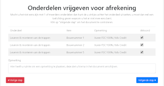 Zodra wij de trappen voor uw project geleverd hebben, ontvangt de uitvoerder – na montage – een digitale afrekenstaat per mail. In deze mail vindt u een link, via welke u vervolgens deze afrekenstaat per bouwnummer kunt inzien en beoordelen. Binnen deze omgeving heeft u ook de mogelijkheid om onderdelen af en/of goed te keuren, opmerkingen te plaatsen en dit te ondertekenen (inclusief uw bedrijfsstempel). Bovendien kunt u ook uw eigen afrekenstaat toe voegen, zodat deze aan de factuur gekoppeld kan worden.