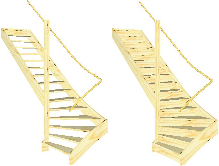 Afhankelijk van de indeling van de woning kunnen wij een trap met onderkwart toepassen. Dit betekent dat het begin van de trap, aan de onderkant, een draai van 90 graden maakt. Daarom wordt dit ook wel een kwarttrap genoemd. De kwartdraai bestaat uit verdreven treden. De treden zijn aan de binnenkant dan minder breed dan aan de buitenkant. Op ongeveer een derde uit de buitenkant zijn alle treden even breed. Dit is de denkbeeldige looplijn die ervoor zorgt dat een onderkwart trap gemakkelijk beloopbaar is.